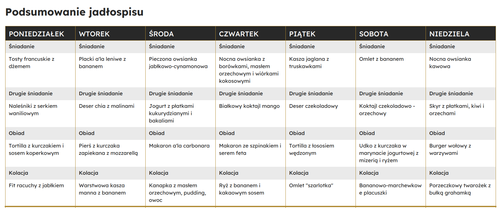 • Poprawę nawyków żywieniowych – jadłospis jest dla osób, które nie wiedzą z jakich produktów korzystać i w jakich proporcjach je stosować.