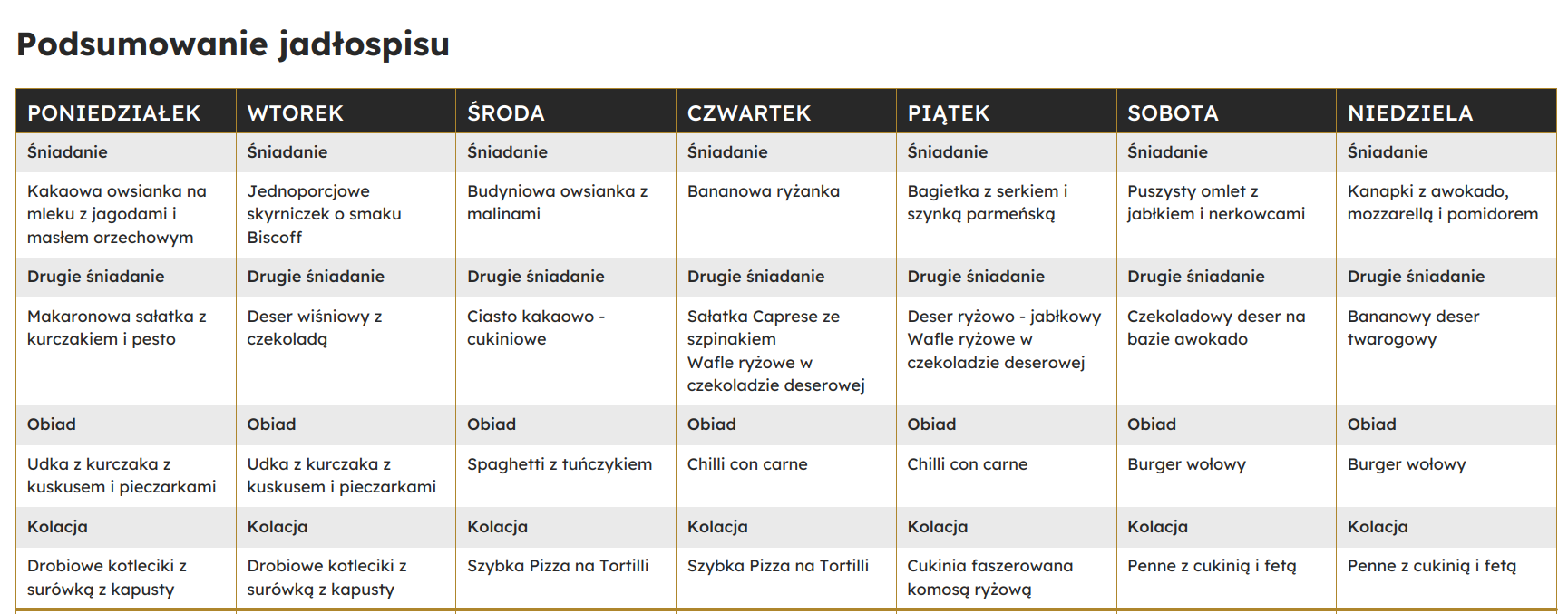 • Poprawę nawyków żywieniowych – jadłospis jest dla osób, które nie wiedzą z jakich produktów korzystać i w jakich proporcjach je stosować.