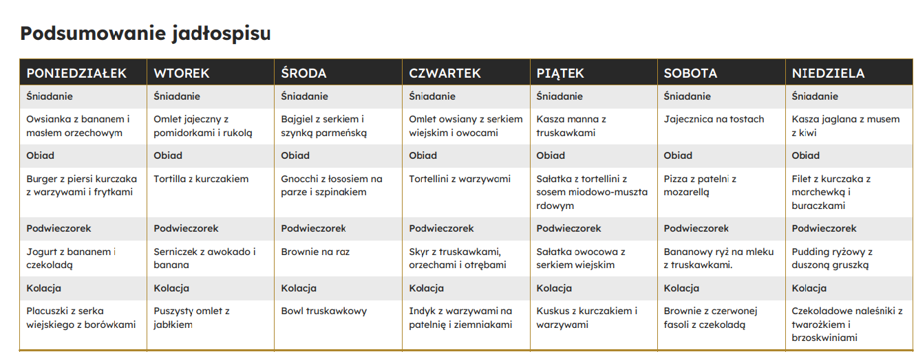 • Poprawę nawyków żywieniowych – jadłospis jest dla osób, które nie wiedzą z jakich produktów korzystać i w jakich proporcjach je stosować.