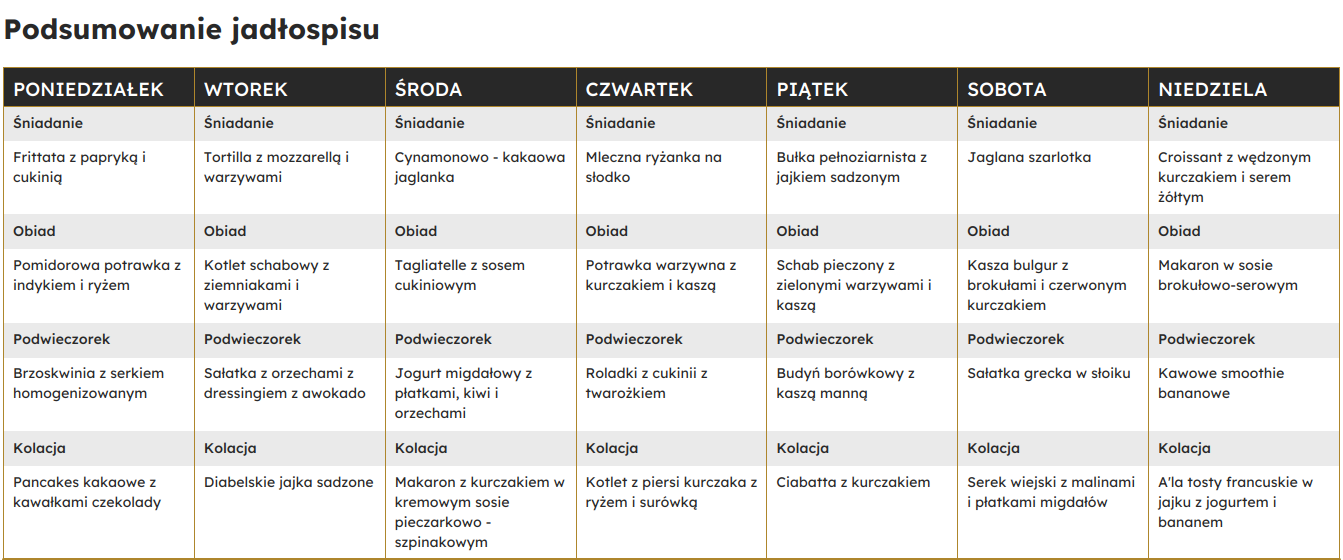 • Poprawę nawyków żywieniowych – jadłospis jest dla osób, które nie wiedzą z jakich produktów korzystać i w jakich proporcjach je stosować.